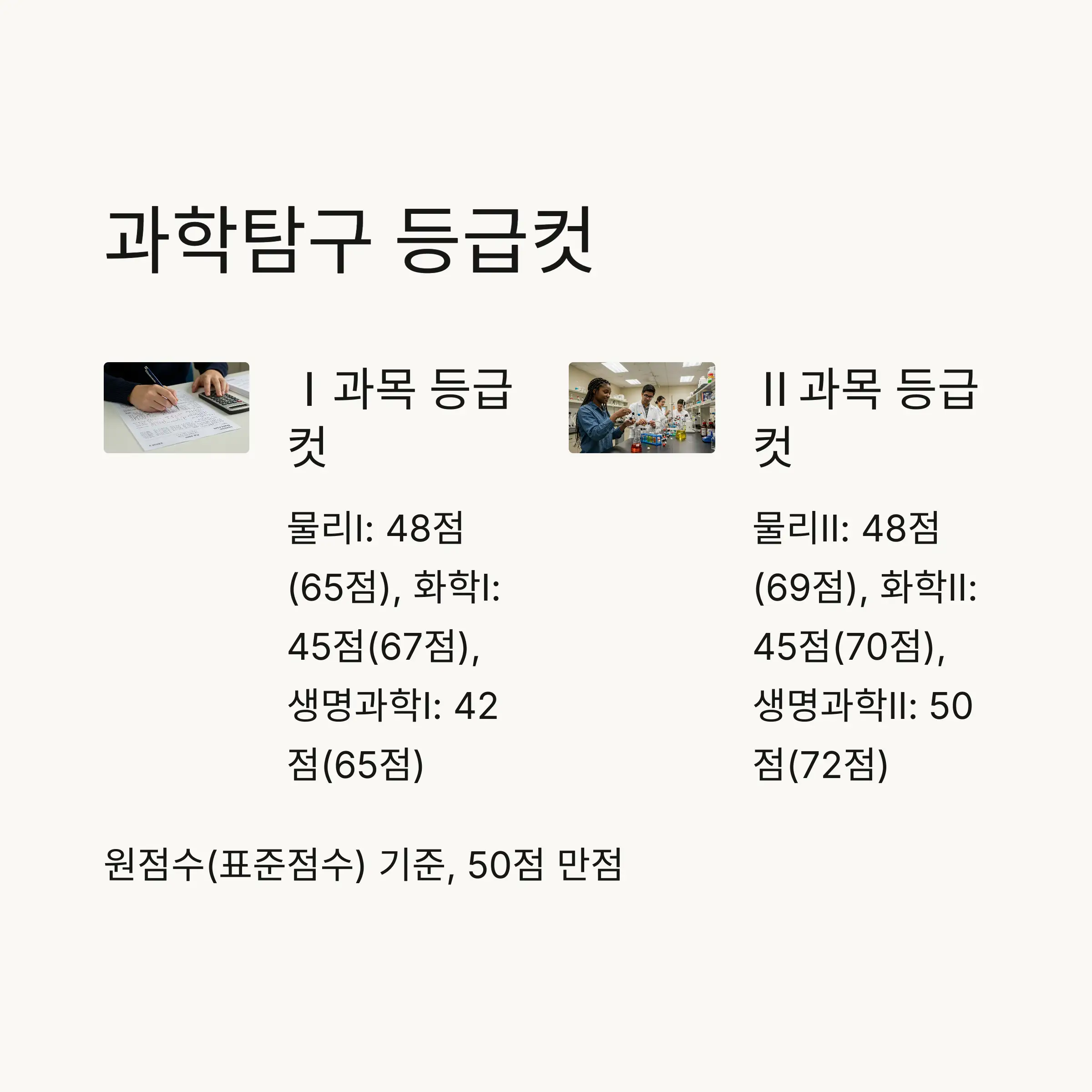 | 생명과학Ⅰ | 42 | 65 | 생명과학Ⅱ | 50 | 72 |