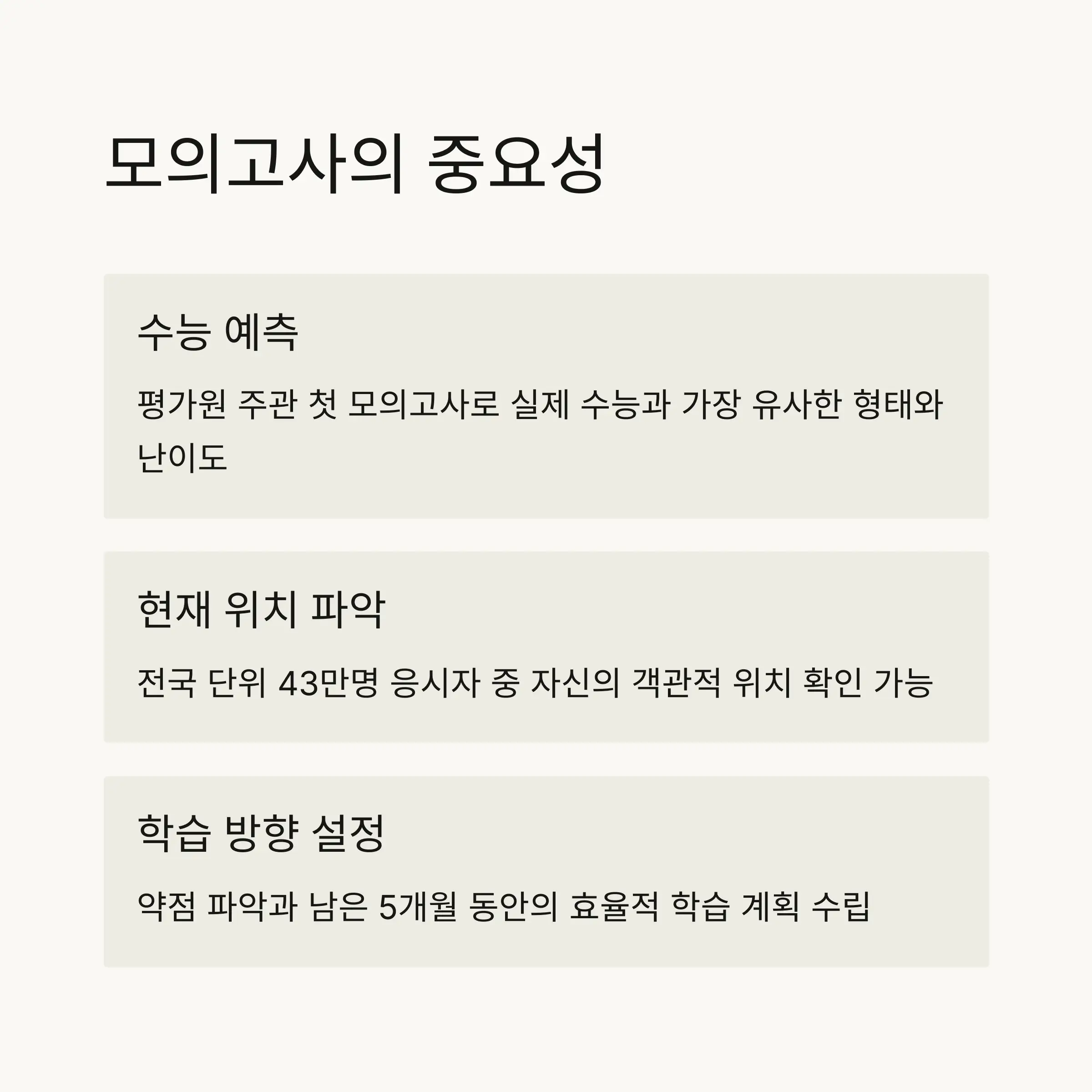 6월 모의고사 결과는 9월 모의고사와 함께 수시모집 지원 전략을 세우는 데 중요한 참고자료가 됩니다. 또한 학생들은 이 결과를 바탕으로 자신의 약점을 파악하고 남은 기간 동안 효율적인 학습 계획을 수립할 수 있습니다. 대학별 예상 지원 가능 점수를 추정하는 데에도 유용한 자료로 활용됩니다. 🎯