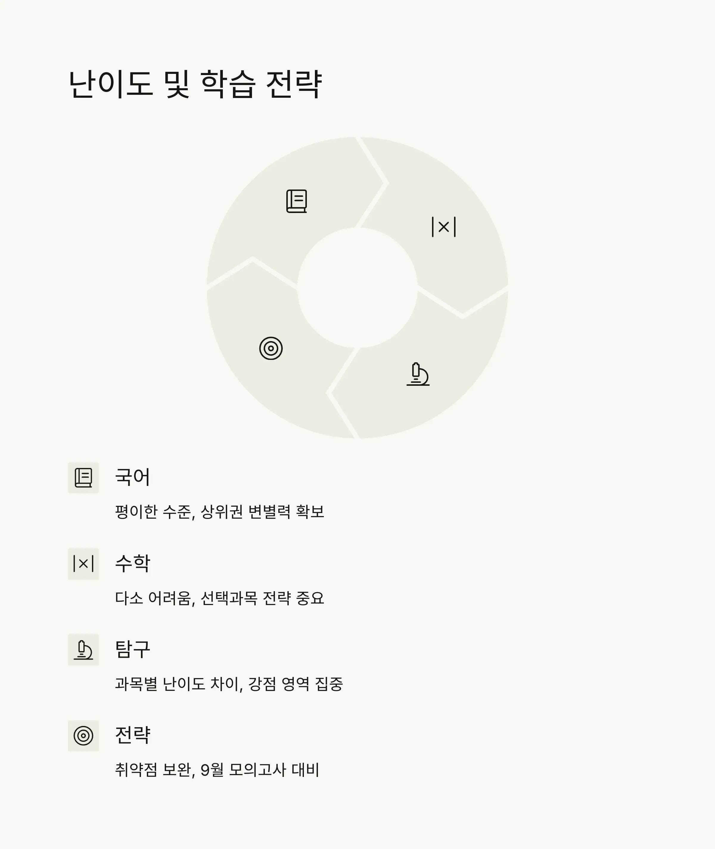 모의고사 결과는 원점수와 표준점수, 그리고 등급으로 나타나며, 각 과목별 등급컷은 시험의 난이도와 수험생들의 전반적인 성취도를 반영합니다. 표준점수는 원점수를 통계적으로 변환한 점수로, 과목 간 난이도 차이를 보정하여 공정한 비교가 가능하게 합니다. 1등급은 상위 4% 이내, 2등급은 상위 11% 이내 등으로 상대평가 방식으로 결정됩니다. 📊
