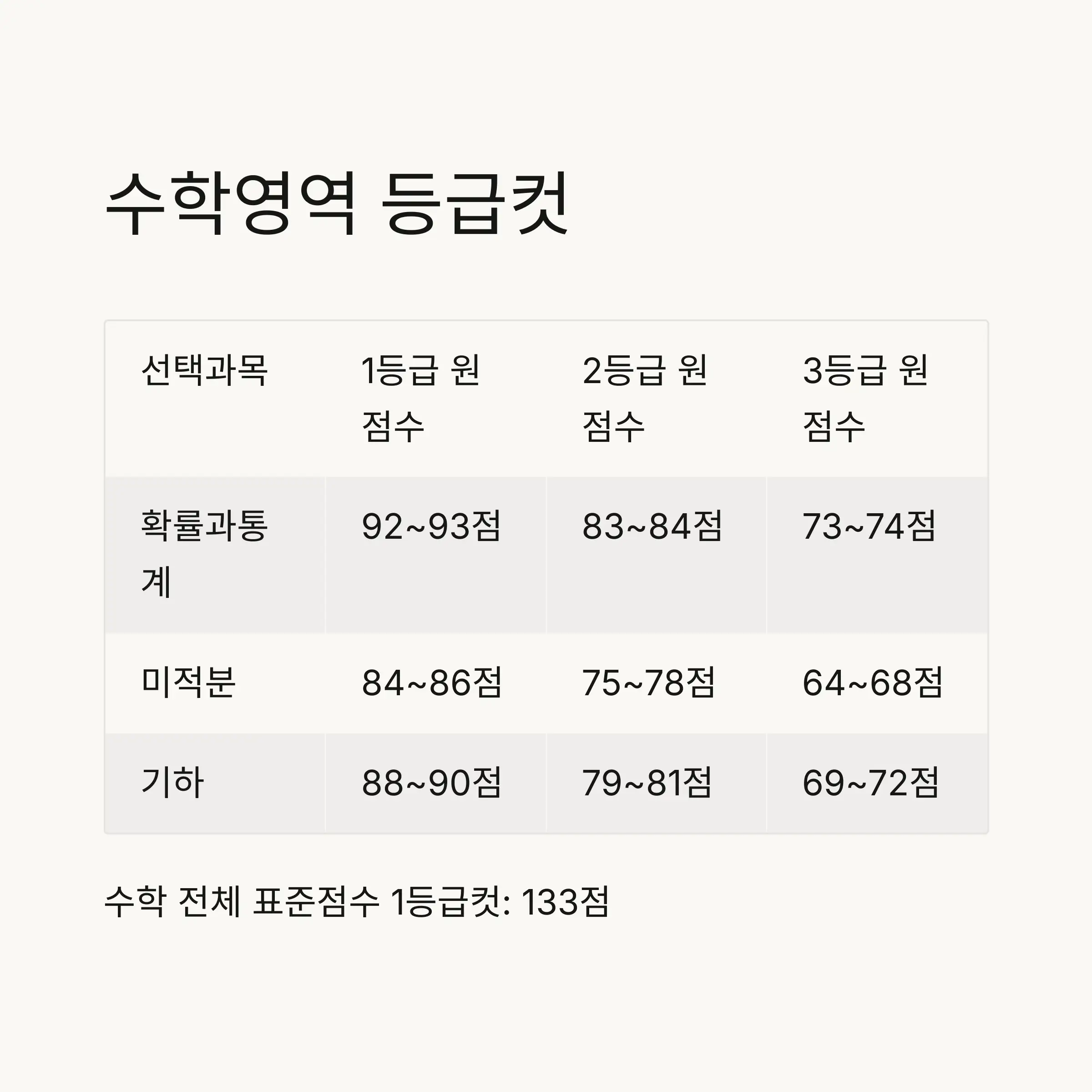 | 1등급 | 133 | 92~93 | 84~86 | 88~90 |